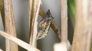 2023年10月14日 枯れススキ茎で蛹化したキアゲハ蛹 |