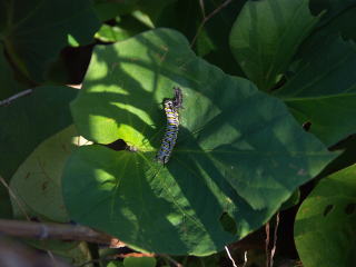 サツマイモの葉で脱皮したばかりの幼虫 |