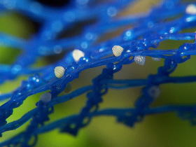 スミレの鉢植え側に防風ネットの切れ端を置き、それに産卵させた。 |