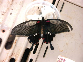 筑波の井上さんという研究者の依頼で、鹿児島の山川町フラワーパーク職員の伊東さんが園内で採れたナガサキアゲハの幼生を送ったところ、3頭の有尾型が羽化して内2頭が鹿児島(福田晴夫先生宅)へ里帰りしたもの。ハンドペアリングは二町氏に行ってもらった。(2004年8月19日) |