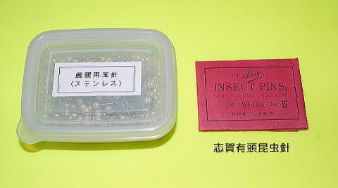 ステンレス製、200本入り。 パール玉が付いており展翅板に刺しやすい。